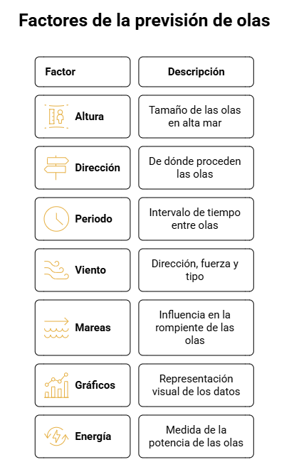 Hay tres factores principales dentro del oleaje que tener en cuenta. Son la altura o tamaño de las olas en alta mar, la dirección del oleaje que indica de dónde proceden y el periodo de las olas que señala su potencia y calidad.